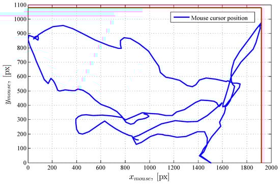 Figure 17 shows a simulation of moving the mouse cursor on a screen with a horizontal resolution = 1920 and vertical resolution = 1080. The red frame shows the screen size of 1920 × 1080 px. The transformation of the player’s CoP position in the local frame {G} to the screen local frame was carried out according to Equation (13). Of note is the fact that the cursor position moved within the defined screen resolution. The procedure used to trigger the simulation of clicking the left mouse button was the same as the process used for the SPACE key.