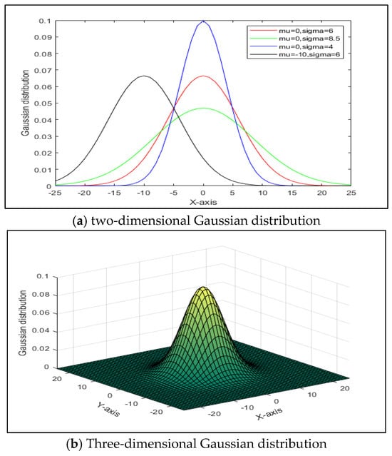 where if , then is called the standard Brownian motion. The standard Brownian motion satisfies a Gaussian distribution. For the sake of simplicity, this study only considers the disturbances of single pedestrian behaviors, so the probability distribution of the random disturbance intensity can be expressed by a single Gaussian function. Figure 1a shows the two-dimensional Gaussian distributions of four groups of different expectation values (mu) and standard deviations (sigma). Figure 1b shows the standard three-dimensional Gaussian distribution when the expectation value is 0 and the standard deviation is 5.