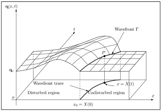 It is assumed that internal disturbances occur in the equilibrium state . The initial solutions of Equations (6)–(8) are and . First, the solutions of the equations near the wavefront are expanded by the power series, as follows: