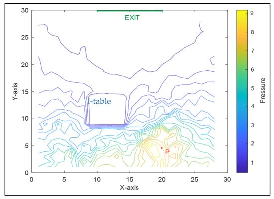 The simulation stopped when the pressure of observation point P reached the maximum value of 7, indicating with a yellow color, at the step = 150. The specific characteristics of the propagation of the disturbance pressure are shown in Figure 3. The contour color indicates the intensity of the disturbance pressure and point P in Figure 3 indicates the burst point of the disturbance pressure in the crowd. We can see from Figure 3 that the sudden disturbance pressure of the crowd fluctuates and spreads with the crowd movements. Moreover, the pressure gradient of the crowd near the obstacle is large.