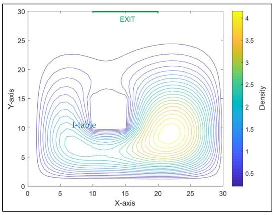 In reality, the pressure propagation of a crowd flow is anisotropic. Using the same numerical analysis method, a crowd flow based on the Hughes model was constructed. The crowd density distribution in the scenario when the simulation step was equal to 150 is shown in Figure 4, where the contour color indicates the crowd density. Comparing Figure 3 and Figure 4, the simulation results of the proposed dynamic model for disturbance propagation in the crowd indicate that the upstream crowd is greatly affected by the disturbance of the downstream population, reflecting the anisotropy of the pressure propagation.