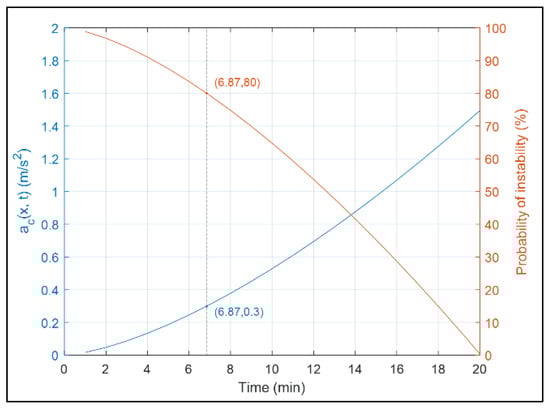 The relationship between the critical stability function and duration of the disturbance is shown by the blue line in Figure 5. Assuming that the maximum allowable acceleration of the studied scenario is , the relationship between the probability of crowd flow instability and the disturbance duration is obtained, as shown by the red line in Figure 5. It can be seen from Figure 5 that the critical stability function value increases with time, and the instability probability decreases. When the simulation time is 6.87 min, the instability probability is 80%. This shows that the disturbance energy decays and the risk probability of the unstable crowd flow decreases with time.