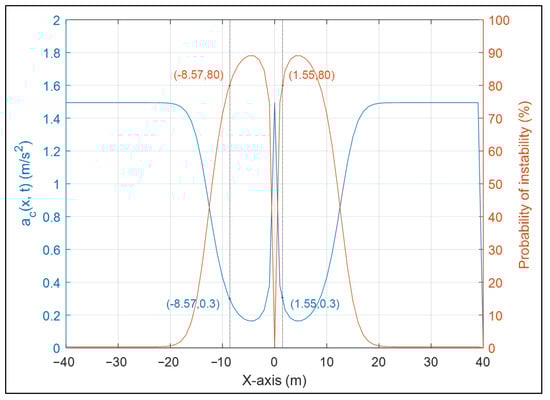 Similarly, taking Equation (39) as an example, the influence of the distance from the disturbance center on the critical stability function value and instability probability of the crowd flow is discussed. If , , it can be seen from Figure 5 that the attenuation time of the disturbance is approximately 20 min. Therefore, in Equation (39), t = 20 min, and the abscissa of the disturbance center . The relationship between the distance from the disturbance center and the critical stability function is shown by the blue line in Figure 6. Similarly, assuming that the maximum allowable acceleration of the studied scenario is , the relationship between the distance from the disturbance center and the probability of crowd flow instability is obtained, as shown by the red line in Figure 6. As shown in Figure 6, with the expansion of displacement, the disturbance energy at a certain point fluctuates and spreads, affecting the stability of the surrounding crowd flow. Without considering the influence of the crowd flow direction, the instability probability of the crowd with the disturbance outbreak point as the center whose radius length is between 1.55–8.57 m is greater than 80%. This indicates that in the safety management of crowd flows, an area of approximately 10 m around the disturbance center needs to be specifically guided and controlled.