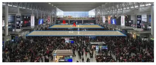 Waiting hall of Shanghai Hongqiao Railway Station. Note: captured by Tongji University CIMS group on 30 April 2023. Note: point A is the center of panic disturbance, B is the observer position.