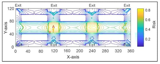 Distribution of crowd aggregation risk discretion based on the hybrid crowd aggregation risk assessment model. Note: point A is the center of panic disturbance, B is the observer position.