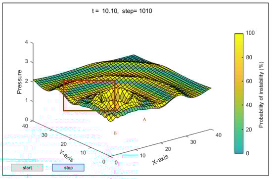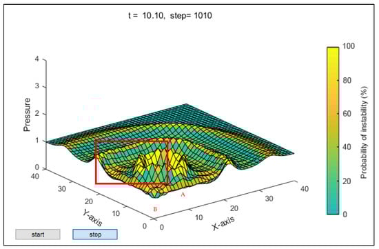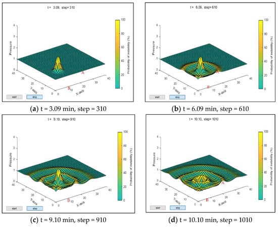 Experiment 1: The initial density of the crowd was set as , and the disturbance pressure ; the propagation of the disturbance pressure and the probability distribution of the crowd flow instability are shown in Figure 9. The Z-axis represents the crowd pressure, and the graph color represents the probability of crowd instability.