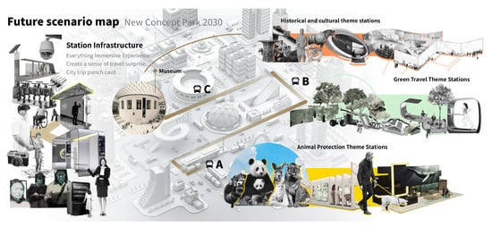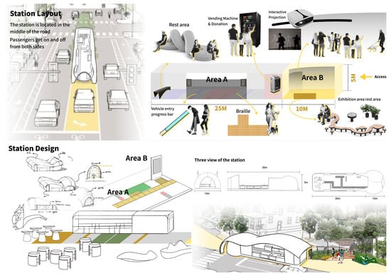 Group A believes that due to the rapid development of various driving-related technologies, including fixed-speed cruise, intelligent blind lane, display and inputs units, communication interfaces, data storage, etc. (see Figure 2). In the next 5–10 years, the transportation system will be more prosperous, and the concept of the Internet of Everything will be further developed. More specifically, people will pay more attention to diversified feelings according to the different experiences, scenes, and ways of interacting. As illustrated in Figure 2, the future scene focuses more on the diversification of station themes and the enhancement of the user’s immersive experience via interactive scenes. Using the themes “history and culture”, “green travel”, and “animal protection” as examples, they proposed three future station concepts for distinct themes and employed story-telling techniques related to the themes to enhance their imagination of future scenes.