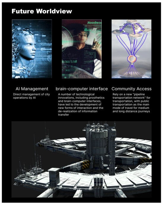 In comparison, Group B has a more negative attitude toward the future. Specifically, they believe the temperature will rise significantly while the living area of humans will decrease due to the greenhouse effect. As a result, the competition for resources will be severe, and the transportation system will be used for inter-community travel due to the closed community model. This group’s constructed future scenario is depicted in Figure 3. At the same time, the interaction between humans and technologies will be more entirely managed by Artificial Intelligence (AI), and the Brain–Computer Interface (BCI) concept will be incorporated into subsequent designs. Future scenarios involving human travel will rely on pipeline transportation networks to facilitate community communication. For medium- and long-distance journeys, public transportation will be the primary mode of transportation at this time.