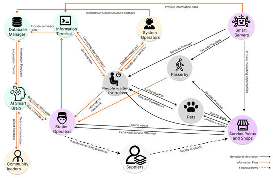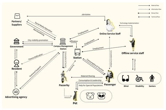 Because of the divergence in how future scenes are envisioned, there is a significant contrast in the design concepts between Groups A and B. However, they both build ecosystem loops (see Figure 4 and Figure 5) on a Gigamapping basis, considering the stakeholders associated with their respective systems. On the one hand, Group A creates different themes for the station, including historical culture, green travelling, animal protection, etc. As shown in Figure 4, the group’s ecosystem loops prioritize the provision of services. These themes can be adjusted according to the location, and they require consideration of the relationships between stakeholders such as government, community management departments, advertising and insurance companies, equipment suppliers, etc. On the other hand, since Group B is confident about technology development, it is essential to sort out the information flow in the stakeholder map (see Figure 5). They paid particular attention to the relationship between the station operation department, the service suppliers, the database management, and the users (including intelligent service providers, passengers, pedestrians, electric and/or natural pets, etc.). The final design output of those two groups is described hereafter.