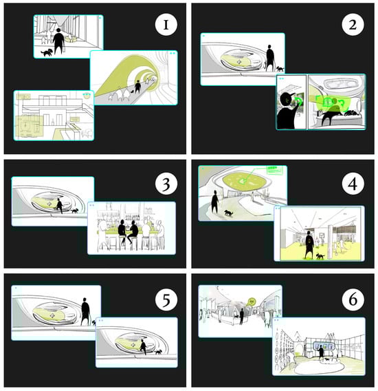 Group B provided a visual representation of how the site might offer the services in a storyboard (see Figure 7). First, the target station is found under the guidance of Augmented Reality (AR) navigation through the prescribed security check channel in the station. Secondly, the station system then prompts the user to board the bus in a timely manner, and the user engages in video call communication with the consumer while on the bus. Thirdly, upon prompting by the station system, the user exits the bus promptly and then locates the customer’s location in order to negotiate. Fourthly, users can interact with the interactive devices on the platform within the station’s viewing area and use the voice assistant to comprehend the specific content of the interactive video. Furthermore, rapid lanes offer charging services. Next, users communicate with the system in real-time through the BCI. Moreover, the station provides pet storage services to meet the various needs of different users.