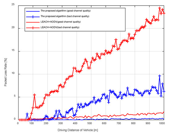 Considering the train is moving and the surrounding environment is constantly changing, it is necessary to validate the performance of the proposed algorithm under circumstances of different channel quality. In Figure 4, we depict the average packet loss when the train is at different positions and obtain the results for different channel qualities. The figure shows that the packet loss rate has an increasing trend, which is because the data packets are sent to the previous station as the train moves on. As the channel quality changes from good to bad, the received signal power decreases, and the packet loss rates of the proposed algorithm and the comparison algorithm both increase. However, the comparison algorithm is affected by channel quality and driving distance more seriously than the proposed algorithm. When the channel quality is bad, the maximum packet loss rate exceeds 20% for LEACH and AODV, while that for the proposed algorithm can still be below 10%. The reason is that as the train moves away from the station, the improved ACO algorithm can always find the best way depending on the shortest distance to neighboring nodes, routing direction, and node loads.