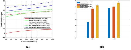 Figure 5a shows the relationship between end-to-end delay and arrival rate. Since the arrival rate represents the number of packets arriving per time unit, the network becomes more congested with the increase in arrival rate. It can be seen from the figure that as the network becomes congested, the end-to-end delay of all services increases and the delay of LDQSP is lower than that of non-LDQSP. Figure 5b shows the error bars of the mean of end-to-end delay. The bars in Figure 5b represent the mean values of end-to-end delay when the arrival rate gradually increases, and the vertical line at the top of the bars represents the standard deviation of end-to-end delay when the arrival rate gradually increases. It can be seen that LDQSP has less delay than non-LDQSP, especially for strict security safety, which is decreased by about 50% compared with non-LDQSP. The results confirm that our low-delay queuing strategy can significantly guarantee the high-priority services.