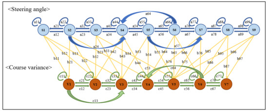 In Figure 3, the steering angle could transition to the next state or sometimes to another state over the next state, which means that the steering angle changed slowly or rapidly. Likewise, the transition of course variance means the course-altering speed. As the ship’s steering angle and course changed slowly along the rudder and the ship’s movement [23], the expected shape of the Markov chain for both variables was a line shape.