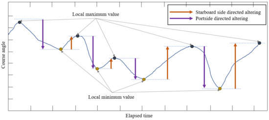 In this research, the altering point is where the course variance stops. When the course stops varying at the local minimum value and rises to the local maximum value, the changed angle is starboard-directed altering. In the opposite case, it is portside-directed altering. An illustrated explanation is shown in Figure 4.