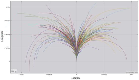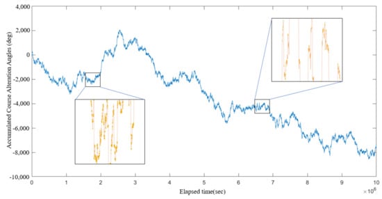 The above Markov chains are in discrete seconds. The random-walk simulation was conducted in ten million seconds to cover most altering cases. A total of 166,305 course alterations were extracted, as shown in Figure 8, and their trajectories are shown in Figure 9 using distinguishable colors for each.