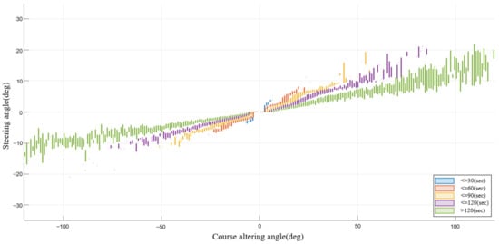 The estimation accuracy was calculated upon cross-validation by separating the training and test datasets for objective results. The estimated average steering angles vary over course alteration angles and time. Figure 10 shows the populated experts’ course-altering and steering angles in elapsed times without outliers for clear visualization.
