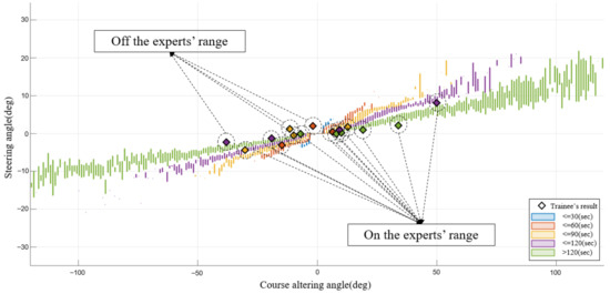 The simple ship-handling training focused on steering ability, which prevents the ship from deviating from the charted route. When the trainee’s trajectory showed the minor average deviation of 5.750 cables in Figure 11a, the rudder steering angles changed dramatically in Figure 11b. This fact infers that training evaluation should approach various aspects besides the specific threshold-based evaluation. Figure 12 overlaps the trainee’s results on the experts’ average steering trends. As the diamond marks colored by each elapsed time denote, some marks are matched in colors, and others are not. Table 2 shows specific results comparing the trainee’s training data to the experts’ trend data.
