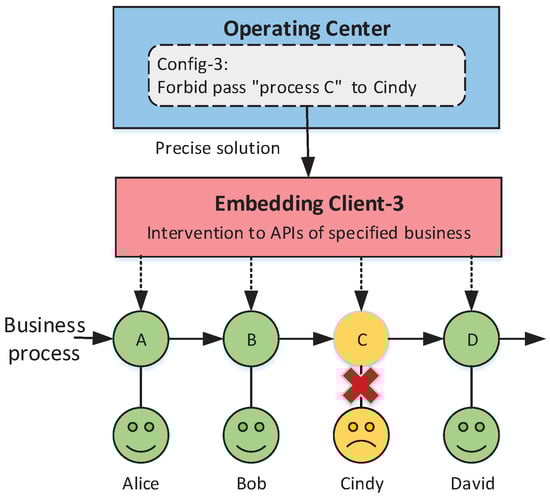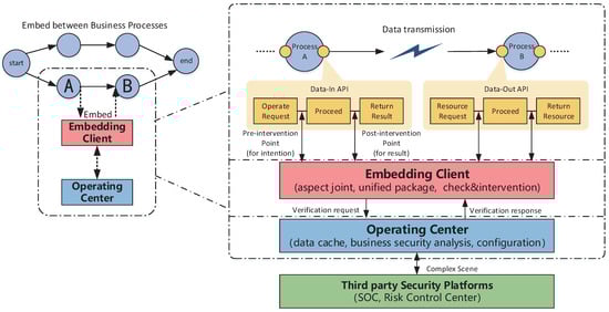 To ensure the preservation of the underlying business while demarcating business security concerns from broader application considerations, the embedding client is meticulously structured along the principles of aspect-oriented programming [44]. This design ethos enables the encapsulation of security functionalities within a coherent and cohesive package. Within the dynamics of the business process, the transmission of data between Process A and Process B transpires via API invocations. The embedding client assumes the pivotal role of infusing aspect joints into the business APIs, realizing this integration in a minimally intrusive manner. The aspect joints are dichotomized into pre- and post-intervention points, thereby harmonizing contextual insights and operational interventions during API execution. The pre-intervention point serves to validate the legitimacy of the request intention, while the post-intervention point ascertains the alignment between the response outcome and the identity of the requester.
