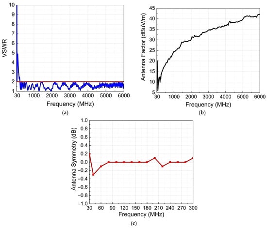 Benchmark performance of the proposed antenna: (a) VSWR, (b) antenna factor, and (c) antenna symmetry.