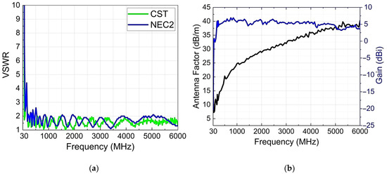 Simulated result of the (a) VSWR; (b) antenna factor and gain.