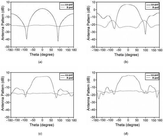 Simulated result of antenna patterns: (a) 200 MHz, (b) 500 MHz, (c) 1000 MHz, and (d) 2000 MHz.