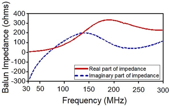 The L-shape feed structure with two variable parameters of X (5.5 mm) and H (2 mm), as depicted in Figure 6a on the tip of the antenna, also presented the tapered configuration of each spacing over the booms. To attain this balance symmetry capability, quasi-air coil Balun with a bound of five as a 1:1 turn is utilized at the antenna’s feed point. It offers the essential wideband matching and proper current phase for the elements, effectively covering the frequency range of 30 MHz to 200 MHz. In Figure 6b, the proposed Balun is an indispensable device for antenna-feed networks. It connects a balanced two-conductor port to an unbalanced port through a semi-rigid coaxial cable, where the radius a is 15 mm, spacing c is 4.6 mm, circumference L is 94.2 mm, and the total height is 60 mm. Figure 7 shows the simulated result of the real part (solid red line) and imaginary part (dot blue line) of Balun impedance. The Balun operates effectively across a wide frequency range and optimizes antenna performance. The proposed Balun not only reduces the unbalanced current on the surface of the feeding cable but also ensures accurate radiation characteristics of the bowtie part of the antenna in wideband. The structure can be easily configured on this antenna through the feeding cable directly without adding any extra components such as a matching circuit or transformer. The results confirm that the proposed Balun is suitable for the Bi-log hybrid antenna. Its feeding technique for this antenna has low design complexity and is easier to implement than traditional antennas.
