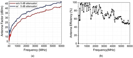 Measured result of the (a) antenna factor with and without 5 dB attenuator and (b) antenna efficiency.