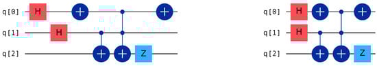 The graphical notation of quantum circuits is inspired by Penrose graphical notation [], which provides a graphical representation for mathematical operations with tensors and for multilinear functions. As an example, two circuits that perform the same calculation are shown in Figure 1. As can be seen, only the relative order of gates is important for single-qubit gates, while gates that act on many qubits require that all qubits involved in the computation be in the correct state before the gate can start its operation.