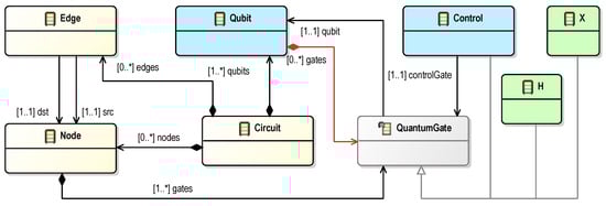 These six meta-classes, together with their relationships, constitute a minimal core for modelling quantum circuits. Of course, the metamodel should be extended, by inheriting from the abstract base meta-class (QuantumGate) to add all the gates available in the general unitary quantum circuit model. For the sake of simplicity, only two gates, which are needed to model the example quantum circuit described below, have been added to the metamodel (coloured in green): H (the Hadamard gate, to create superposition) and X (the NOT gate). This version is sufficient for the purposes of this paper. The containment relationship between Qubit and QuantumGate, coloured in red in Figure 2, will be justified in Section 5.3 and can be ignored for now.