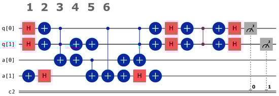 The measure of the top two qubits (the bottom ones are ancilla qubits, employed to perform intermediate calculations) always yields the result , meaning that the princess can know for certain that box B contains the kitten. The numbers appearing above the circuit are used to refer to the gates that appear below them, and are employed in the graphs depicted below to better identify the part of the quantum circuit they refer to.