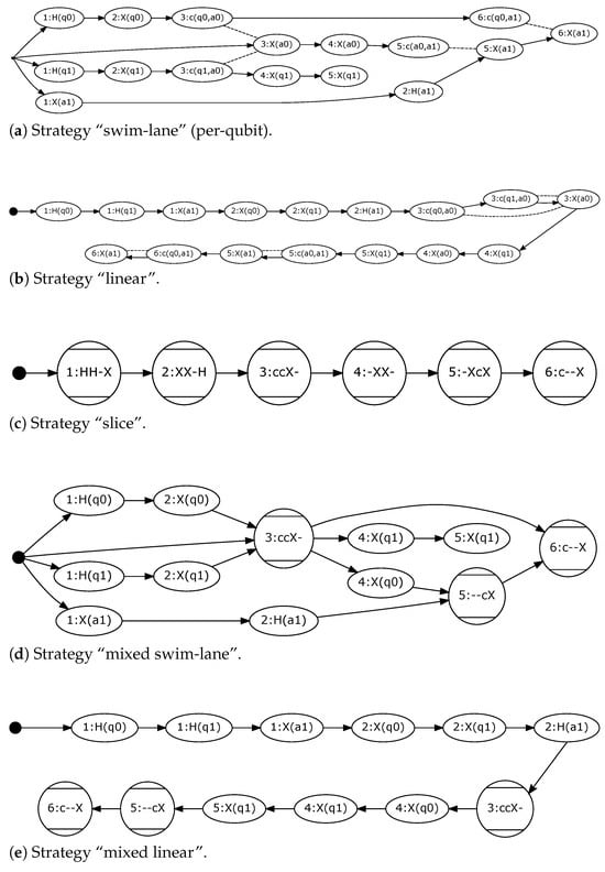 - The “slice” strategy can be transformed into/from either the “swim-lane” or “mixed swim-lane” ones by realising that a given slice (Node) contains gates operating over different qubits. Thus, it is possible to generate the “swim-lane” version by creating Nodes containing only one gate and creating Edges connecting the Nodes containing gates operating over the same Qubit, in the order defined by the input circuit. The same procedure applies to generating a model that follows the “mixed” strategy but, in this case, controlled gates must be stored in the same Node. Again, the correspondence between these strategies is 1-to-1.