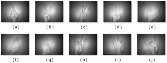 Hand gesture recognition in an infrared environment has many advantages compared with methods using a visible environment. The hand gesture recognition in this paper is conducted in an infrared environment. Some researchers have used both a visible light environment and an infrared environment for hand gesture recognition. In 2014, Erden and Çetin proposed a multi-mode hand gesture detection and recognition system []. They used both infrared and visible environment information. In 2021, Yu et al. used reflected visible and infrared light signals for hand gesture recognition []. The simultaneous use of visible and infrared environments can enhance the system’s robustness. However, sometimes, the two-camera mode results in difficulties with system development and additional costs.