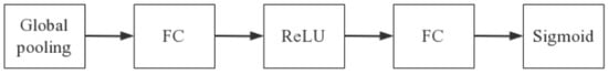 The channel attention mechanism enables the model to learn the channel weights, which emphasizes the significant features with large weights while suppressing the unimportant features with small weights; therefore, it improves the model’s performance []. The Squeeze-and-Excitation Network (SENet) is a commonly used channel attention mechanism []. The core part of the network, namely the Squeeze-and-Excitation (SE) block, is shown in Figure 4. The block consists of a global average pooling layer, two full connection (FC) layers, and two activation functions (ReLU and Sigmoid).