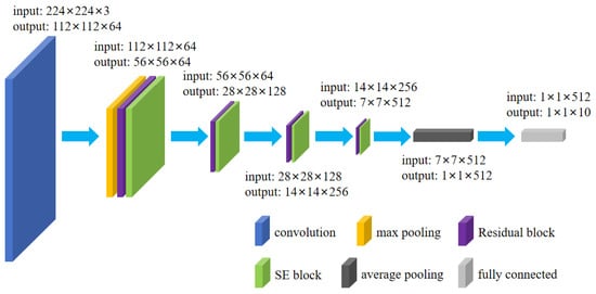 This paper embeds the SE block in ResNet-34, as SE-ResNet-34, to enable the ResNet-34 to learn channel weights to improve the model’s performance. The architecture of SE-ResNet-34 is shown in Figure 5. In this paper, the SE block is independent of the residual block, rather than being embedded in the residual block. We embed the SE block after each residual block, so that the network can learn the channel weights of the output features of each residual block. Due to there being only 10 types of gestures in the dataset, the output dimension of the last layer of the network is changed to 10.