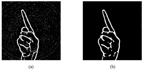 Gesture contour extraction. (a) Adaptive threshold binarization. (b) Median filtering.