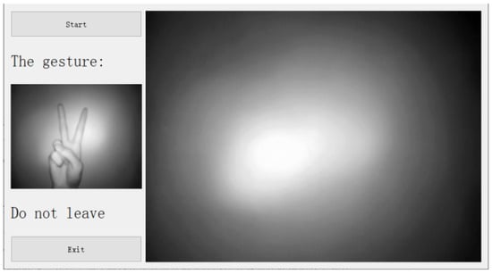 Then, the system starts to track the hand. If no hand is detected in two consecutive frames, the words “Do not leave” will appear on the interface, as shown in Figure 11. If the user wants to continue to use the system, he/she needs to click the “Start” button again.