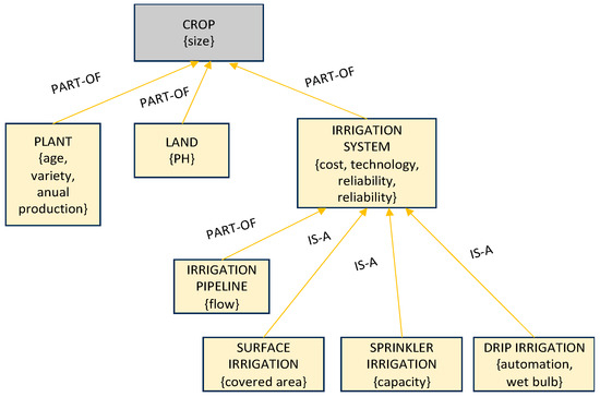 For the example introduced above, following the terminology introduced in previous sections, the set of concepts C of all the input ontologies is {CROP, PLANT, LAND, IRRIGATION SYSTEM/WATER SUPPLY SYSTEM, IRRIGATION PIPELINE, SURFACE IRRIGATION, SPRINKLER IRRIGATION, DRIP IRRIGATION} = {c1, c2,…, c8} can be defined. In addition, the set of attributes AT of all input ontologies is {crop.size, plant.variety, plant.age, irrigation system.cost, irrigation system.technology, irrigation pipeline.length, irrigation system.reliability, surface irrigation.covered area, land.ph, plant.annual production, irrigation pipeline.flow, sprinkler irrigation.capacity, drip irrigation.automation, drip irrigation.wet bulb} = {a1, a2,…, a14}, where the notation ai = ‘x.y’ stands for ‘the attribute y linked to the concept x in MHRD1, MHRD2 or MHRD3′.