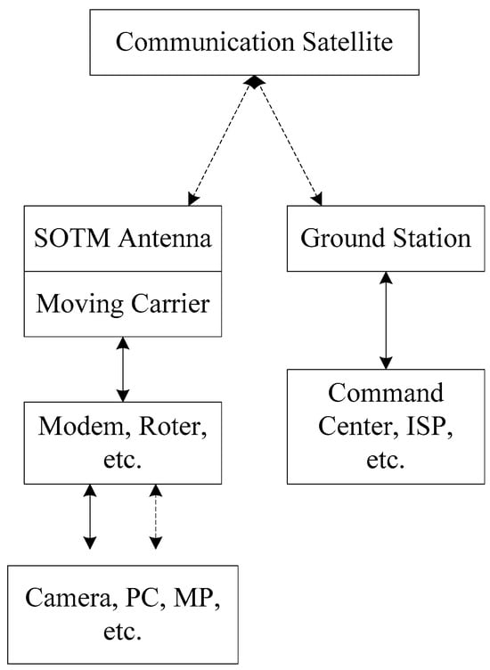 The SOTM antenna is installed on a moving carrier, its location remains relatively stationary with respect to the moving carrier, and the communication link is established through wireless means. Network devices, such as modems and routers, primarily handle tasks such as data forwarding. They typically establish communication links with the SOTM system through cables. Additionally, they establish links with user terminal devices such as closed-circuit television (CCTV), personal computers (PC), smartphones (SP), etc., through cables or wireless communication; this enables the establishment of a complete communication link between the user’s terminal devices and entities such as the ISP and command center.