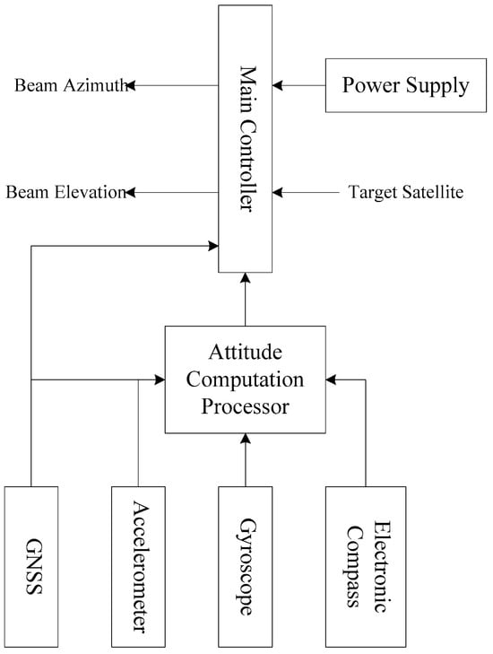 The current systems that use array antennas generally employ a combination of electronic beam steering and mechanical tracking control methods [18]. Ref. [19] designed a stepper motor servo control system based on the analysis of the SOTM servo control system and proposed a speed-position dual-closed-loop PID controller with disturbance compensation. In Ref. [20], a modeling method for a three-axis SOTM antenna based on a novel modified Denavit–Hartenberg method was investigated, which addresses the gimbal lock issue by adding a roll axis in addition to the conventional azimuth and elevation axes. Ref. [21] designed an Active Disturbance Rejection Controller based on particle swarm optimization to overcome the issues of response speed and accuracy for the SOTM antenna servo control system. Ref. [22] designed a Ku-band SOTM structure that included multiple distributed panels capable of mechanical oscillation and presented a new pseudo-monopulse tracking method. The SOTM systems utilize Global Navigation Satellite Systems (GNSS), compasses, and inertial navigation systems to measure the position and attitude of the carrier, automatically adjusting the azimuth angle and elevation angle of the antenna beam to align with the target communication satellite. The application of the SOTM systems is becoming increasingly widespread [23,24], and their operating conditions are becoming more complex, as they are unknown and dynamically changing [25]. Due to the carrier’s motion, its location and attitude are constantly changing [26], and current methods can meet the satellite tracking requirements of array carriers in general motion states. However, when the carrier’s attitude changes beyond certain conditions, from reference [27], this condition is generally described as angular velocity , or angular acceleration , conventional methods may cause a decline in the communication effectiveness of the SOTM system and even cause the antenna to lose the tracking of the satellite and interrupt the communication. After the antenna loses the communication satellite, reacquisition relies on the antenna beam scanning and mechanical tracking system azimuth and elevation axis movements, which increases the time it takes to reacquire the satellite. Currently, research on the high maneuverability of carriers mainly focuses on the estimation of carrier attitude and location [28,29,30,31,32,33], and research on array antenna tracking satellites under a high maneuvering state is limited.