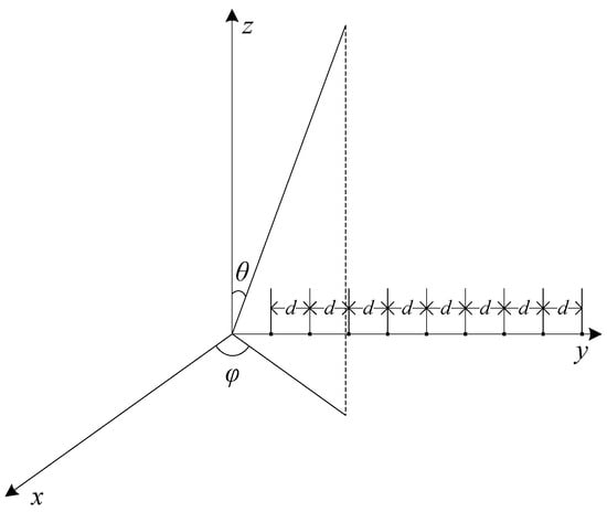 In Figure 3, multiple linear array elements are uniformly arranged along the y-axis. Assuming the elements’ quantity is and the distance between two elements is , as the array factor is rotationally symmetric with respect to the y-axis, we only need to research the array factor in any plane passing through the y-axis. For example, by studying the plane with , which is referred to as the plane, we can obtain the array factor of the plane.