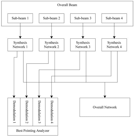 Figure 9 shows a schematic diagram of the design proposal. Each sub-beam is processed through its own synthesis network, and the processed data is sent to its own detection component. The detection component performs beam pointing and energy characteristic analysis on each sub-beam and sends the analyzed sub-beam pointing position coordinate values in the directional pattern to the optimal pointing analyzer. The optimal pointing analyzer analyzes and calculates an optimized array of antenna pointing information, which includes azimuth and elevation angles. This analysis is based on the coordinate values of the sub-beam pointing directions in the directional pattern.