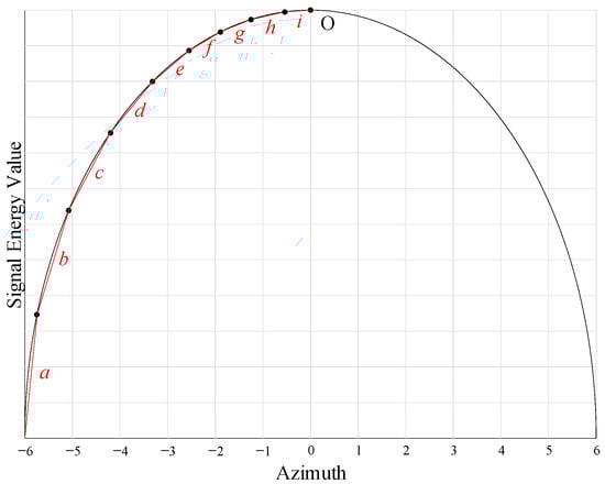 Figure 13 shows a schematic diagram of the piecewise linearization method for the azimuth directional curve of the main lobe. The black dots in the figure represent several points taken along the curve. These points are then connected by straight lines to form the red line segments denoted as a, b, …, i in Figure 13. The equation of each straight line is calculated as follows: