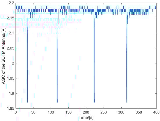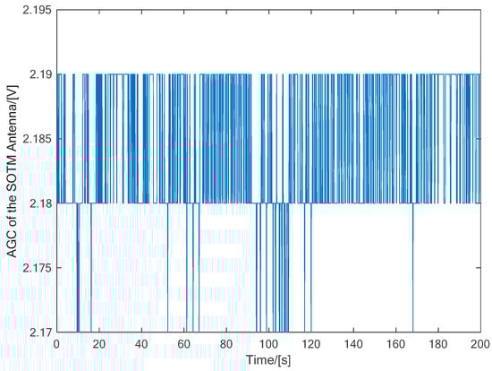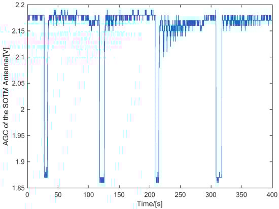 Figure 16 illustrates the real-time Automatic Gain Control (AGC) level of the SOTM system when using the multi-beam fast-tracking scheme with the SOTM array antenna designed in this paper, while Figure 17 illustrates the real-time AGC level of the SOTM system when using the conventional scheme. From the perspective of the real-time AGC level of the SOTM antenna, it can be concluded that when the SOTM antenna remains connected to the satellite, even during the high maneuvering motion of the carrier, there is minimal disparity in communication quality between the two approaches. This result indicates that the multi-beam fast-tracking scheme proposed in this paper does not result in worse communication effects than the conventional scheme.
