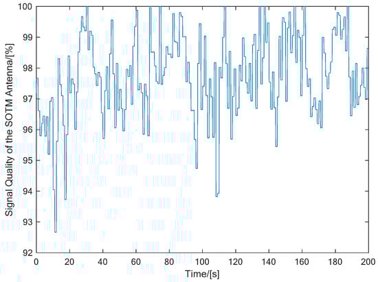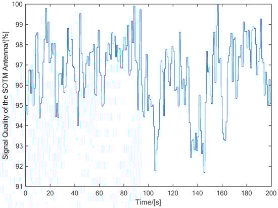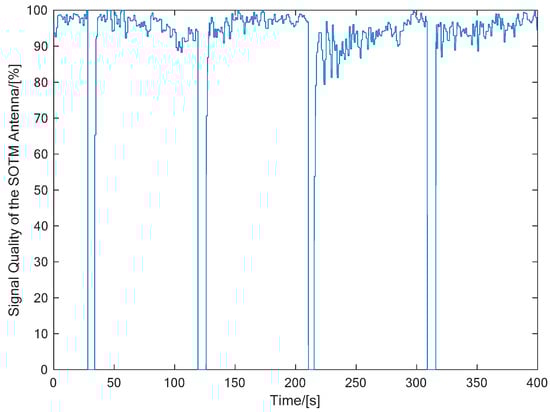 Figure 18 illustrates the real-time signal quality of the SOTM system when using the multi-beam fast-tracking scheme with the SOTM array antenna designed in this paper, while Figure 19 illustrates the real-time signal quality of the SOTM system when using the conventional scheme. From the perspective of the real-time signal quality of the SOTM system, it can be concluded that when the SOTM antenna remains connected to the satellite, despite the high maneuvering motion of the carrier, the approach introduced in this paper can attain superior communication quality compared to the conventional scheme; this indicates that the multi-beam fast-tracking scheme proposed in this paper outperforms the conventional scheme.