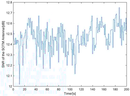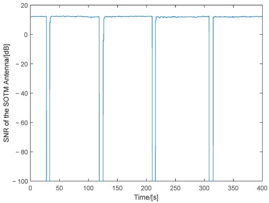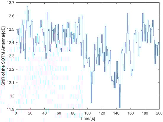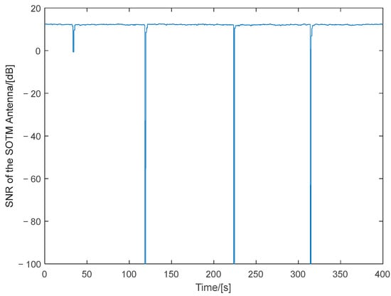 Figure 20 illustrates the real-time Signal-to-Noise Ratio (SNR) value of the SOTM system when using the multi-beam fast-tracking scheme with the SOTM array antenna designed in this paper, while Figure 21 illustrates the real-time SNR value of the SOTM system when using the conventional scheme. From the perspective of the real-time SNR of the SOTM system, it can be concluded that when the SOTM antenna remains connected to the satellite despite the high maneuvering state of the carrier, the proposed scheme in this paper can achieve better communication quality than the conventional scheme, with relatively high SNR and small fluctuations; this indicates that the multi-beam fast-tracking scheme proposed in this paper outperforms the conventional scheme.