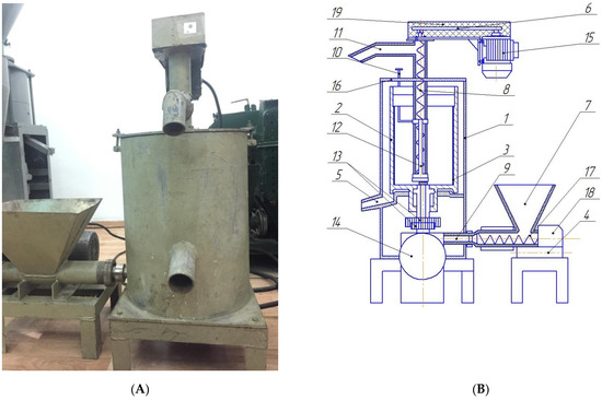 A filtering centrifuge with a vertically arranged filtering drum consisted of a casing and a lid (Figure 1A). A screw discharge device was installed on the lid. Crushed bones were transported from the receiving hopper by the screw of the feeder through the pipeline and fed into the filtering drum rotating inside the casing. The feeder screw was connected through a coupling with a gearmotor. The drive of the filter drum consisted of an electric motor and a gear transmission.