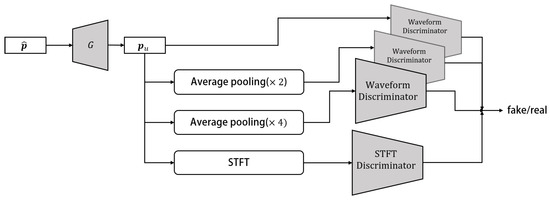 - STFT DiscriminatorThe STFT discriminator is designed to capture the time–frequency characteristics of the input signals by performing an STFT on the input signal, following the approach proposed in [33]. The STFT window length is set to 2048, with a hop size set to half the window length. The network architecture of the STFT discriminator comprises four stacks of 2D convolutional layers, along with batch normalization and a Gated Linear Unit (GLU).