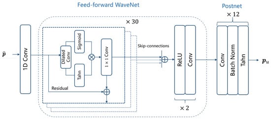 - Generator GThe generator G in the HiFi-GAN architecture consists of a 1D convolution layer, a 30-layer feed-forward WaveNet [31,32], and a postnet module [26]. The feed-forward WaveNet utilizes dilated convolutions with a kernel size of 3 and exponentially increasing dilation factors ranging from 1 to 512. This design yields a receptive field that is exponential in the number of layers. Each dilated convolution is embedded within a residual layer that includes an additional convolution and a residual connection. The contribution of the Tanh activation function in each layer is controlled by sigmoidal gates. The following postnet module consists of twelve stacks of 1D-convolutional layer and batch normalization. Each convolution layer has 128 channels and a kernel length of 32. The activation function used in the postnet is Tanh. The architecture of the generator is shown in Figure 4.