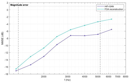 To conduct a quantitative comparison of upmixing errors across different methods, the NMSE values are computed between the spectra of the three considered cases above the aliased frequency and the spectra of the ground truth. These results are averaged over the frequency range. The analysis reveals that the HiFi-GAN method exhibits the lowest error, with an average NMSE of −10.3 dB. The FOA reconstruction approach demonstrates an average estimation error of −7.9 dB. In contrast, the upmixed RIRs generated using the ASDM method exhibit a higher error of −5.3 dB.