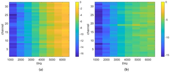Here, the sound pressure is a column vector that represents the sound field measured at each discrete microphone position , . The number of microphones on the surface of the spherical array satisfies , and N is the truncated order of the SH expansion. The Ambisonic signals are put in a column vector representing the SH coefficients of the sound field. The vectors and are defined as follows,